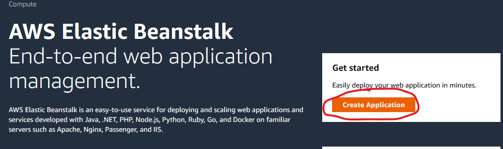 In the AWS Management Console, click on Services in the top left corner, and click on Elastic Beanstalk.