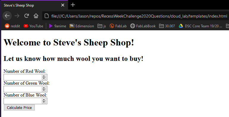 Usually, you could simply add some javascript to add some interactive functionality to your webpage. However, we Steve realises he has a problem. The cost of each red wool, green wool and blue wool is changing all the time! Steve does not want to implement the logic for calculating the cost for the wool on his webpage. Instead, he wants to leave the calculation logic to a server, where he could also do many other things!