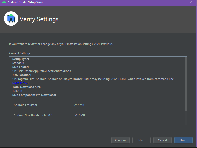 Android Studio has been installed, but it still needs to download some dependencies, such as the Android SDK(Software Development Kit) and JDK(Java Development Kit). Open up Android Studio, which should prompt you with a Setup Wizard. We recommend selecting Standard as your installation type. Just follow the instructions and the Setup Wizard should start downloading your components for you!