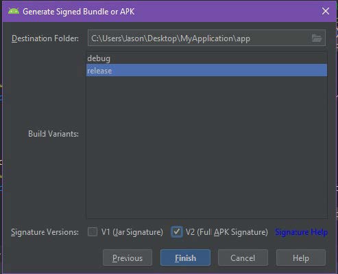 When you are done, click OK, then Next, then select your build to be for release and select V2 for signature version. Then click Finish.
