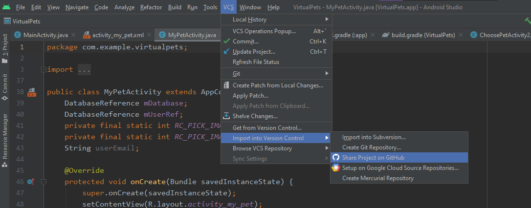 If you would like to publish your code onto Github, you can easily do it using VCS -> Import into Version Control -> Share Project on Github.