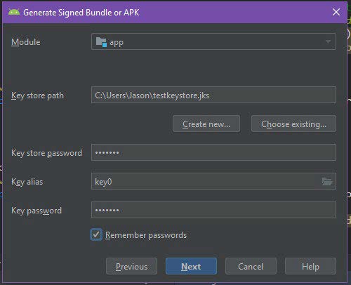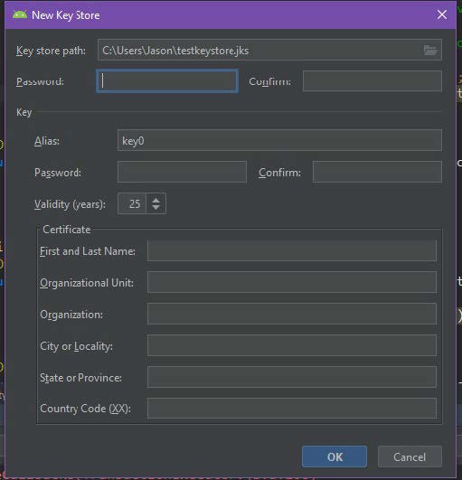 If you don’t have a key store yet, click on Create new..., specify a path for your keystore and fill in the relevant details