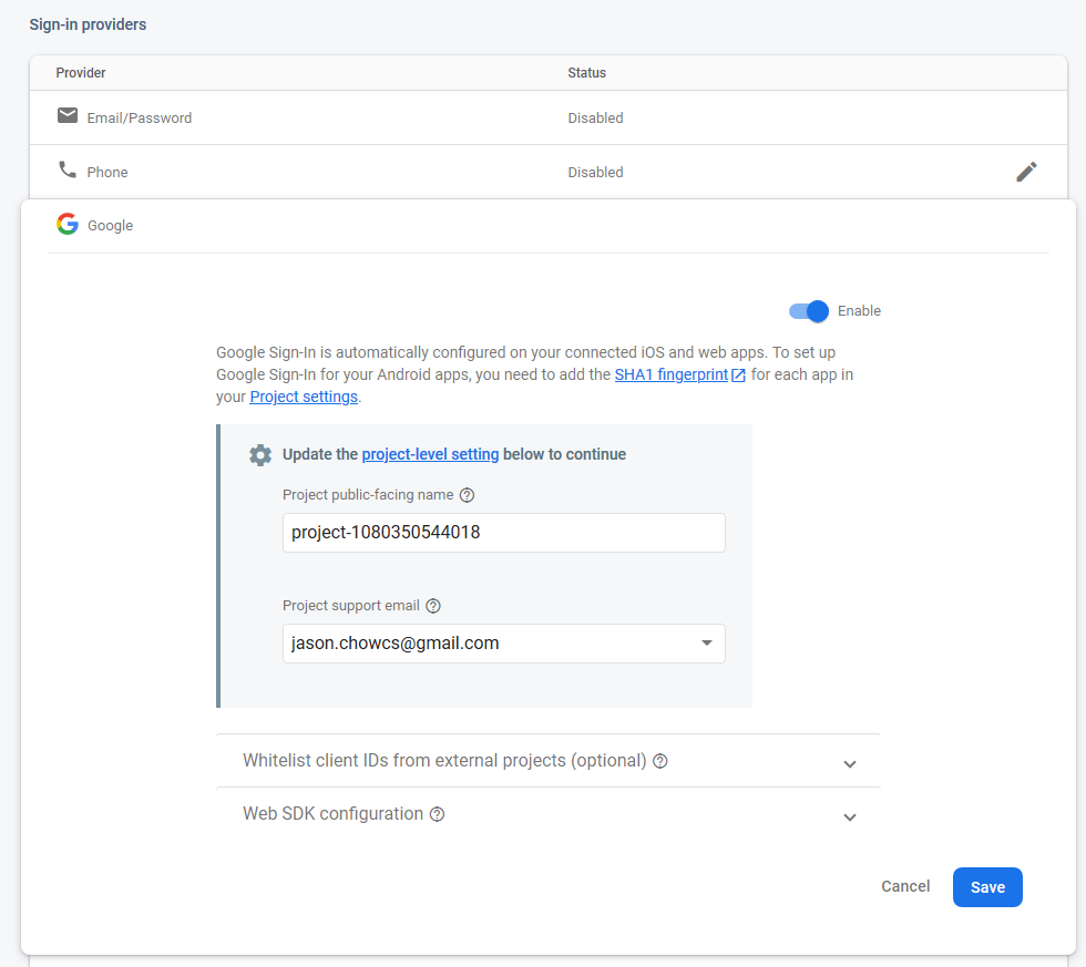 To simplify things, we will just enable Email Sign-in and Google Sign-in for our app.